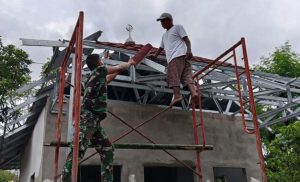 Satgas TMMD bersama masyarakat setempat tampak bekerja penuh semangat menyelesaikan pemasangan atap. Tahapan ini menjadi salah satu pekerjaan penting karena menandai pembangunan musholla telah memasuki fase akhir sebelum proses penyempurnaan. Kopka Wahyu yang tergabung dalam Satgas TMMD Ke-127 Kodim 0819/Pasuruan menyampaikan bahwa pengerjaan dilakukan secara maksimal agar musholla dapat segera dimanfaatkan warga untuk beribadah.
