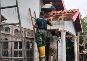 Prajurit terlihat naik-turun tangga bambu sambil memasang resplang secara rapi di rangka atap. Pekerjaan dilakukan bersama warga secara gotong royong, mulai memegang tangga, mengatur posisi material, hingga menyiapkan peralatan kerja.