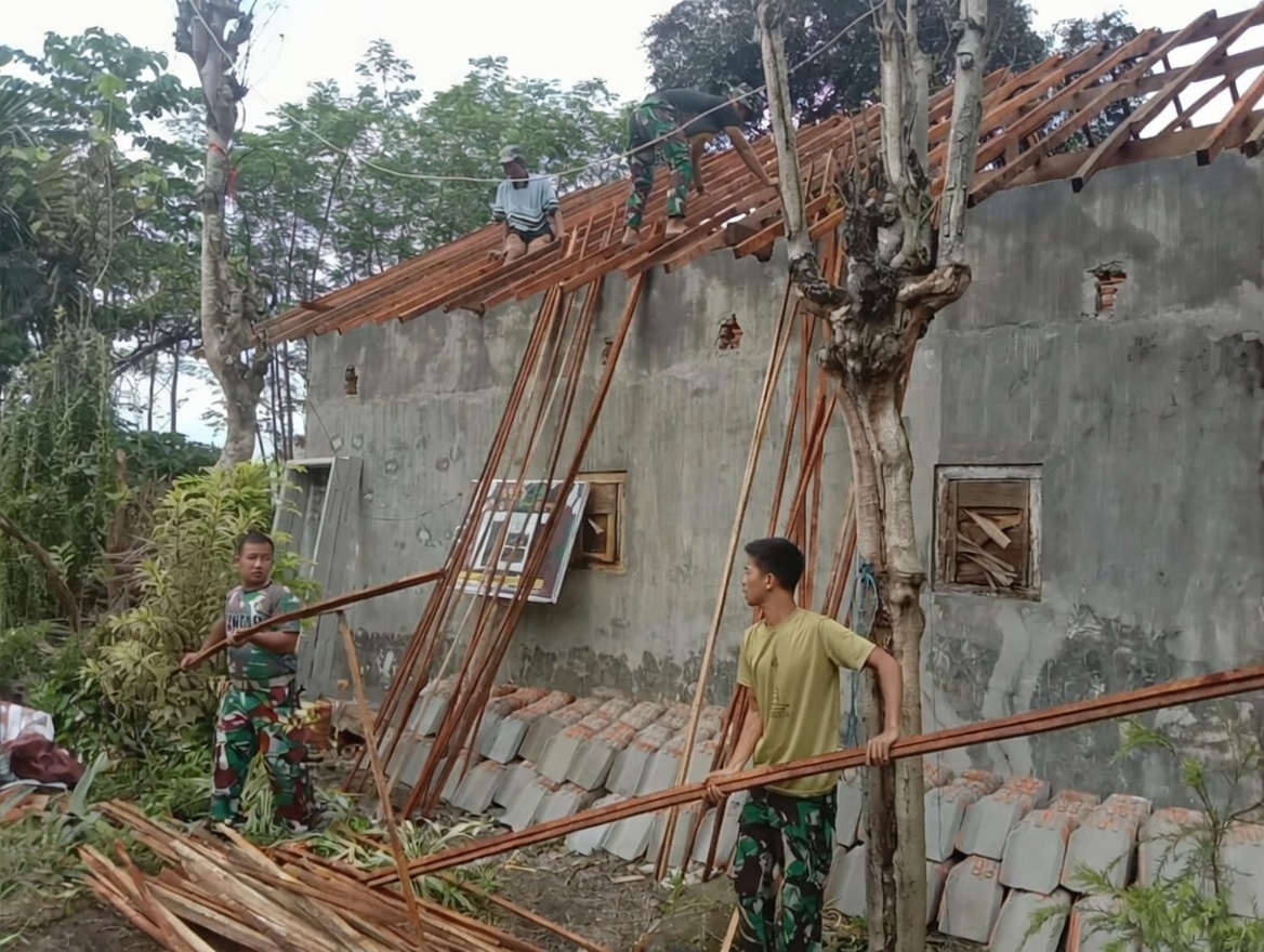 Di bawah sinar matahari pagi yang hangat terdengar irama kerja yang harmonis. Suara palu beradu dengan kayu, derit kayu yang disusun rapi, dan obrolan ringan antar pekerja mengisi udara. Itu adalah pemandangan nyata dari semangat gotong royong yang sedang berlangsung di lokasi Desa Wonosari, Kecamatan Gondangwetan, Kabupaten Pasuruan, Sabtu (28/2/2026)Beberapa prajurit Satgas TMMD Ke-127 Kodim 0819/Pasuruan, mengenakan seragam loreng khas TNI, tengah bekerja sama dengan warga. Dua pemuda berpakaian sipil memegang rangka kayu panjang, sementara yang lain naik ke atas struktur atap yang hampir terbentuk. Pohon-pohon di sekitar rumah memberikan naungan alami, menambah kesan damai di tengah kesibukan.