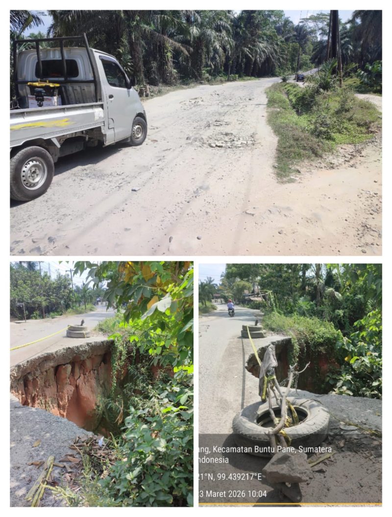 Asahan, // Radarpagi.id Jalan lintas Kisaran–Pematang Siantar di Sionggang, Kecamatan Buntu Pane, Kabupaten Asahan nyaris putus akibat longsor. Terlihat separuh badan jalan sudah longsor di sisi jurang yang membuat kendaraan harus bergantian melewatinya. Warga khawatir jalan akan putus total. Selain itu, sudah banyak kecelakaan yang terjadi akibat jalan rusak terutama di malam hari.