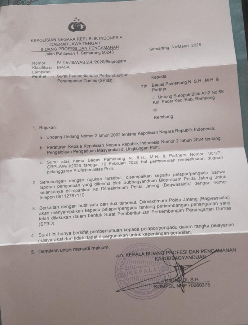 Rembang  ( RADAR PAGI ) – Setelah melayangkan surat pengaduan terkait dugaan pelanggaran profesionalitas aparat Polri, Bagas Pamenang N. S. H., M. H & Partners menerima surat pemberitahuan dari Subbagyanduan Bidpropam Polda Jawa Tengah. Dalam surat tersebut, pihak kepolisian menyampaikan bahwa laporan yang masuk akan dilimpahkan ke Ditreskimum Polda Jateng (Bagwassidik) untuk ditindaklanjuti.