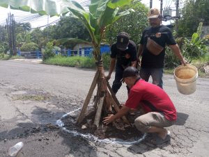 Sebagai bentuk kepedulian dan aksi nyata, puluhan anggota Pemuda Pancasila PAC Taman bersama relawan melakukan aksi penanaman tiga pohon pisang tepat di tengah lubang-lubang jalan yang berbahaya tersebut, Jumat (20/02/2026).