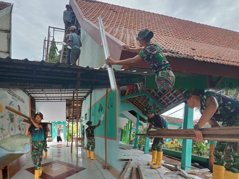 Radarpagi.id Suasana pagi yang masih diselimuti gerimis tipis, kembali bernapas bersama irama palu dan derit bambu. Di halaman SMP Negeri 2 Gondangwetan prajurit Satgas TNI Manunggal Membangun Desa (TMMD) Ke-127 Kodim 0819/Pasuruan bergerak selaras bagai satu tubuh. Seragam loreng hijau tua berpadu dengan sepatu boot kuning cerah menjadi warna dominan yang menghiasi renovasi sekolah di Desa Wonosari, Kecamatan Gondangwetan, Kabupaten Pasuruan, Sabtu (28/2/2026).
